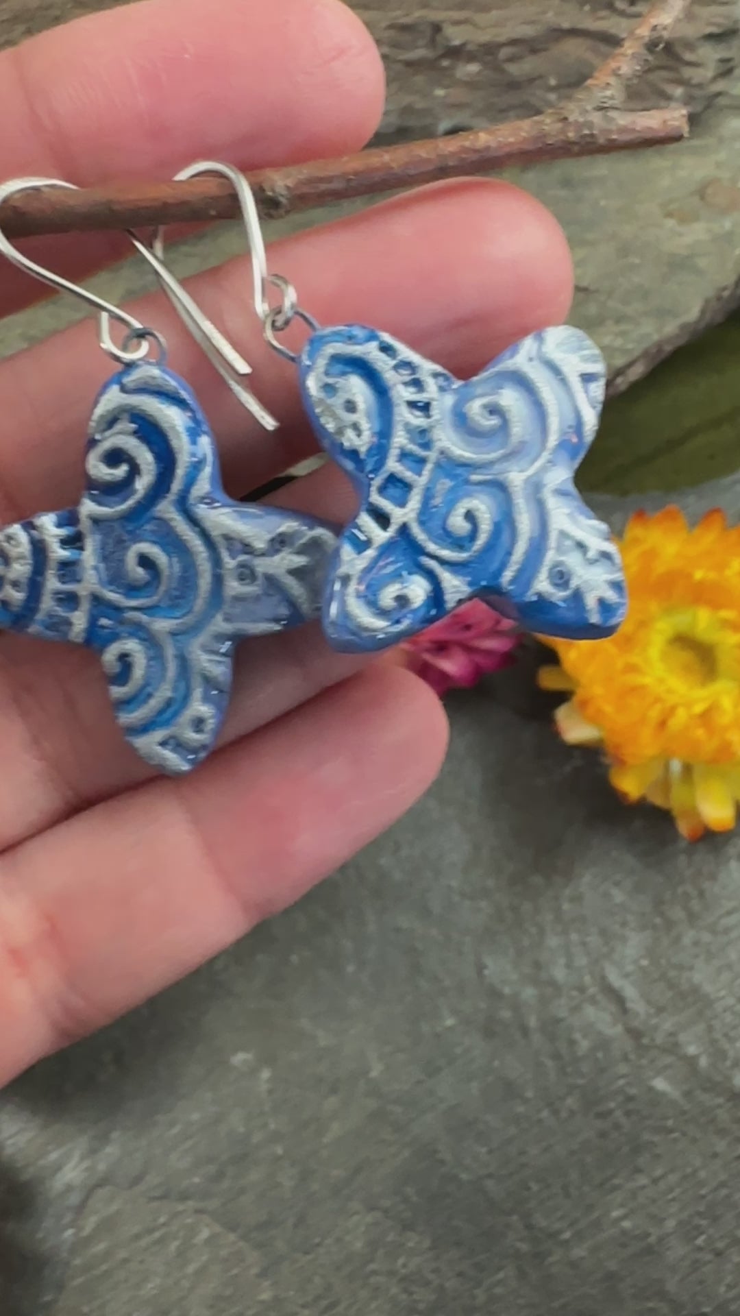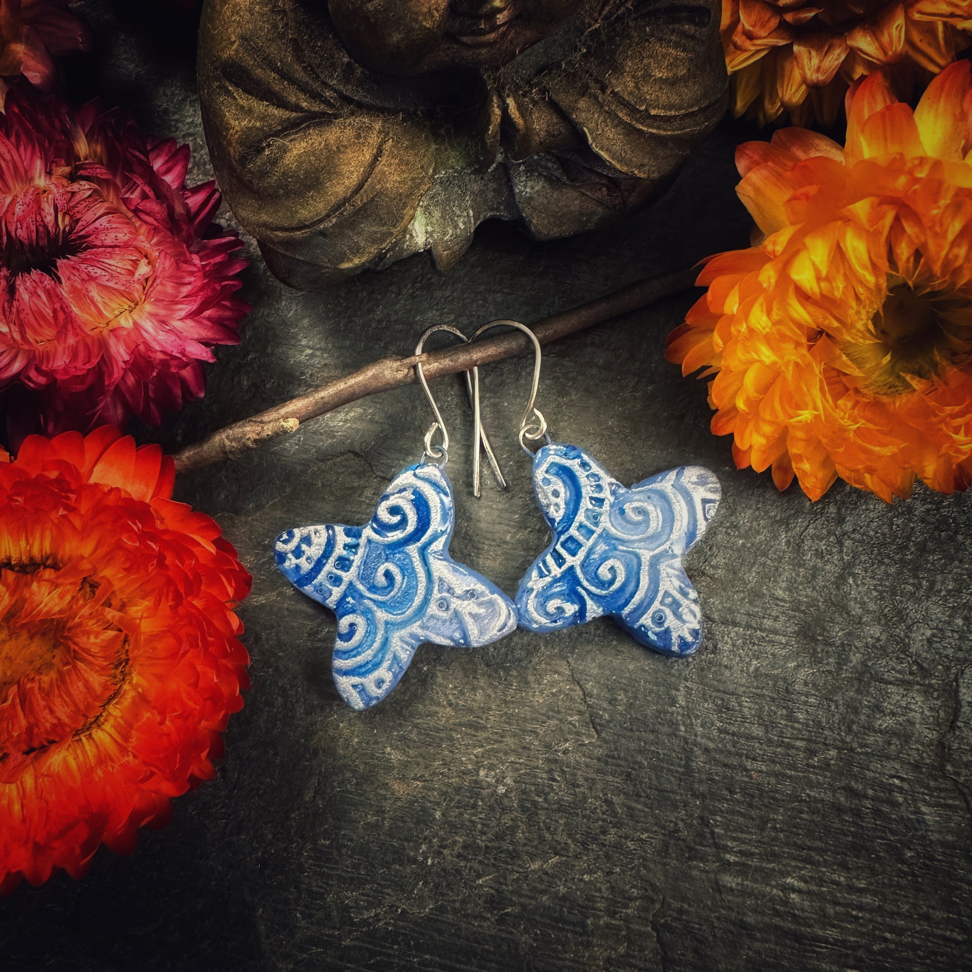 These colorful quatrefoils have been handcrafted from stoneware clay, kiln-fired, cold-glazed in cool shades of cerulean, and dusted with silver for a magical shimmer.